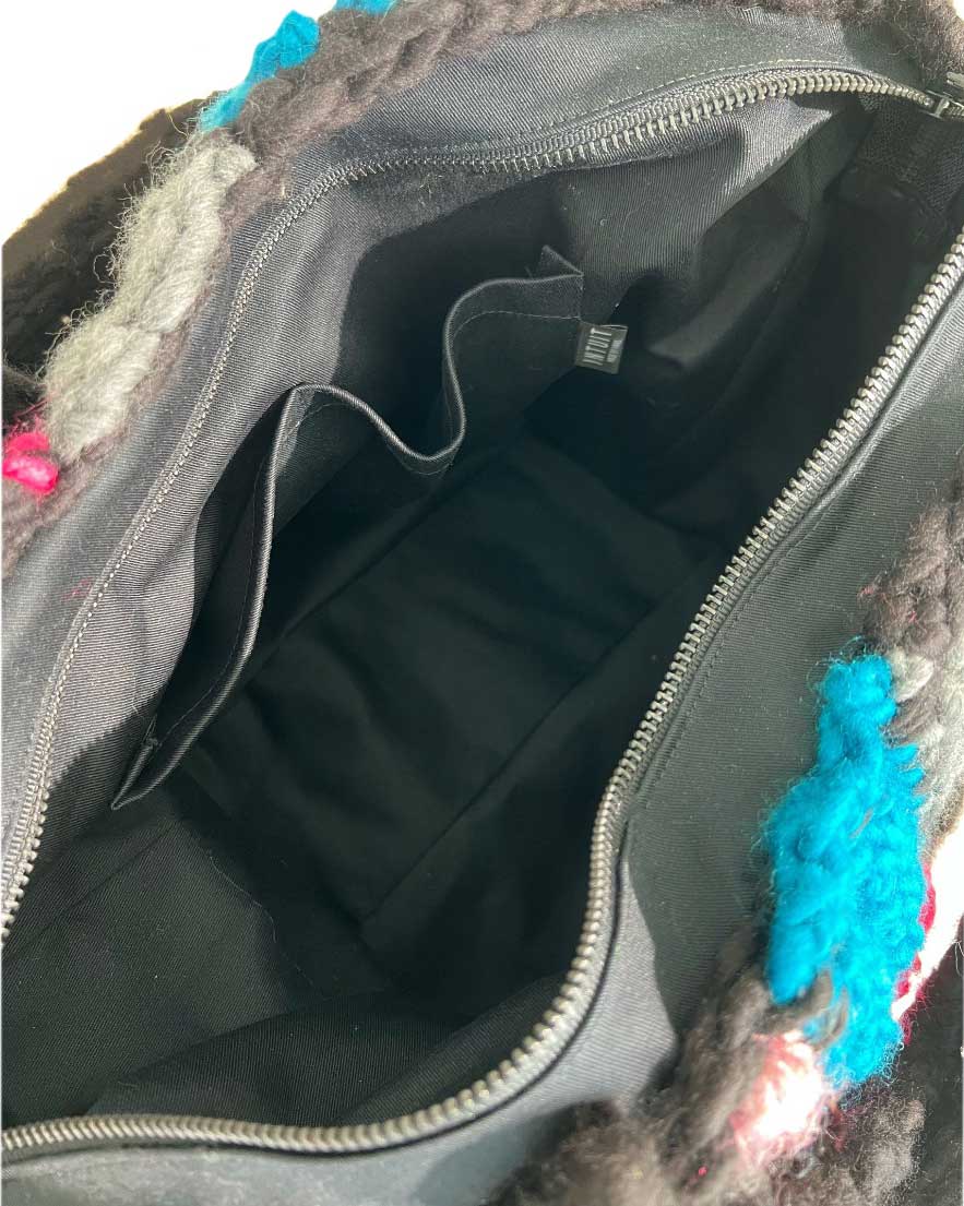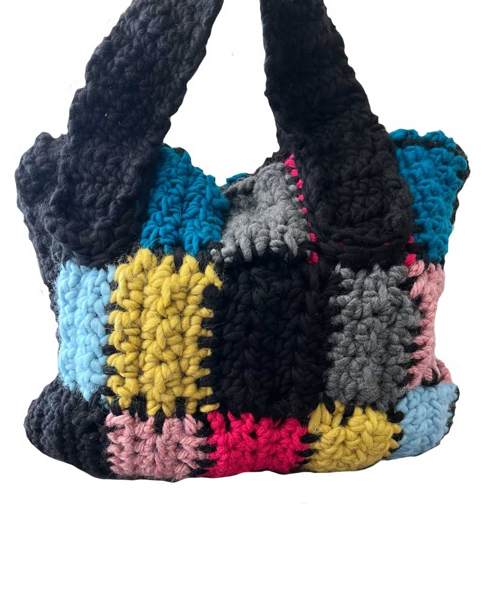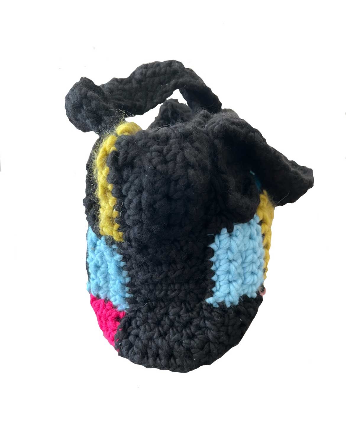 Retro, color block XXL tote, crocheted with multiple colored yarns, and anchored in black wool.